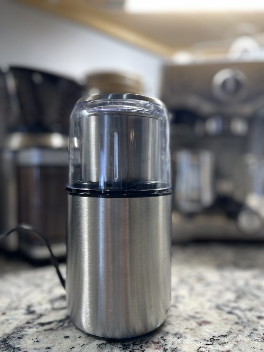 - Fill the filter with grounded coffee, tapping the edges. Coarse ground is most commonly used, but you can adjust your grind to your own personal preference. I purchased a 4 blade grinder to use specifically for our single brew coffee. (Alternatively, we use a burr grinder to make our espresso.)