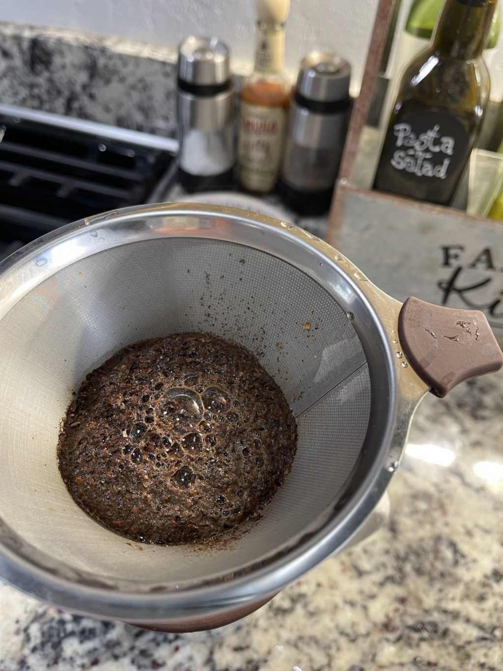 Oils from coffee will naturally build up over time. If you find your coffee isn’t filtering well, you can soak the filter in a mixture of hot water, baking soda, and white vinegar to remove any build-up in the mesh.
