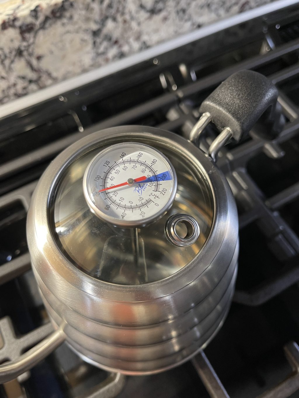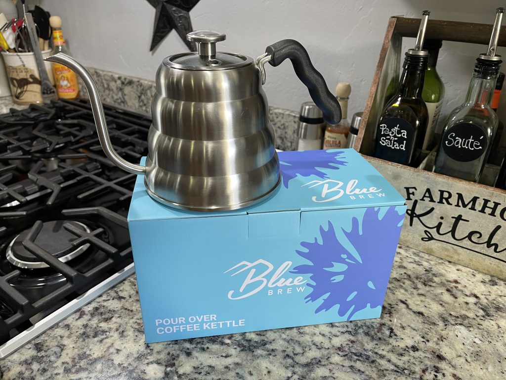 Update: We purchased this gooseneck pour over coffee kettle and LOVE it! It really helps control our pour. The glass top with a built is thermometer is a bonus. The bottom is solid, which is great for our gas stove. Definitely a must have.