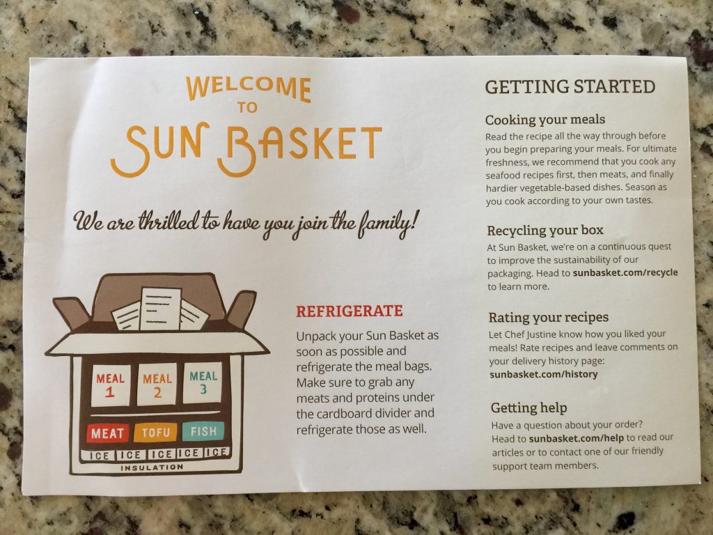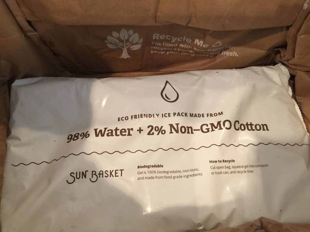 Prior to the delivery, Sun Basket sent me emails and text message updates regarding my order. They let me know they had to substitute skinless chicken for skin on chicken, and assured me it wouldn’t impact the flavor or cook time of my meal. I had left special instructions on where to put the box when delivered, and they followed my instructions. I liked that all the packaging was recyclable. Sun Basket seems to be seriously committed to sustainability. Even the ice package was filled with recyclable materials we could put in our compost.