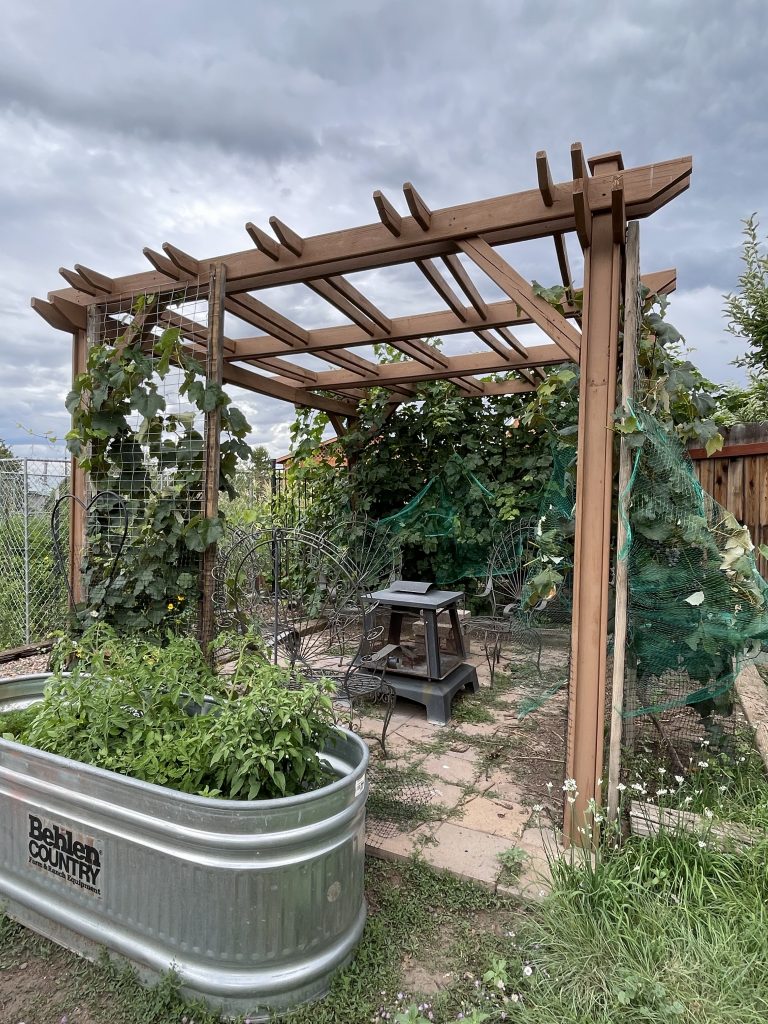 Our house has a chicken coup, so we got a few chickens. Later we found out we have predators in our area, so we had to take defensive measures. We added gutters and rain barrels to recycle water for our garden, fruit trees, grapevines, herbs and lavender.